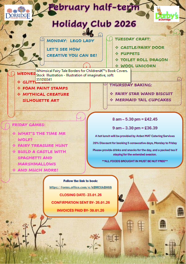 Dorridge Primary School Holiday Club is provided by Darby's at Dorridge. This club is open to children Nursery to Year 6 who currently attend Dorridge Primary School. We provide a wide variety of high quality activities that meet the individual needs and interests of our pupils. Holiday provision is also enhanced through our partnership with Mr Root's sports coaches, our Forest School Lead, Complete Cricket and Stagecoach Performing Arts Group.